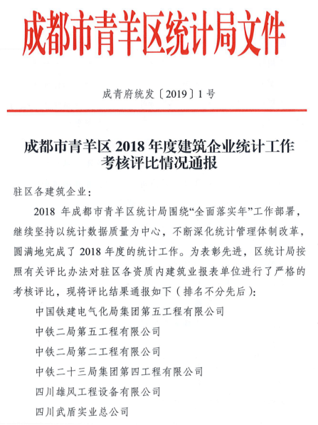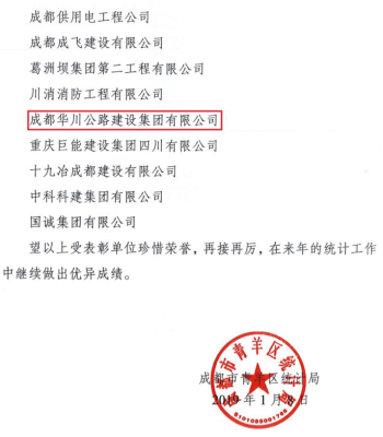 由于上报时间及时、数据准确、流程规范,集团公司、华途公司、华霆公司在青羊区200余家建筑企业统计工作考核评比工作中脱颖而出,体现了集团公司及子公司已规范按照国家大数据统计工作要求开展、落实工作,具有先进性及代表性。