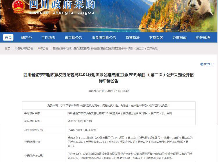 近日,集团成功中标四川省S101线射洪段公路改建工程(PPP)项目。7月5日,四川政府采购网正式发布中标公告。