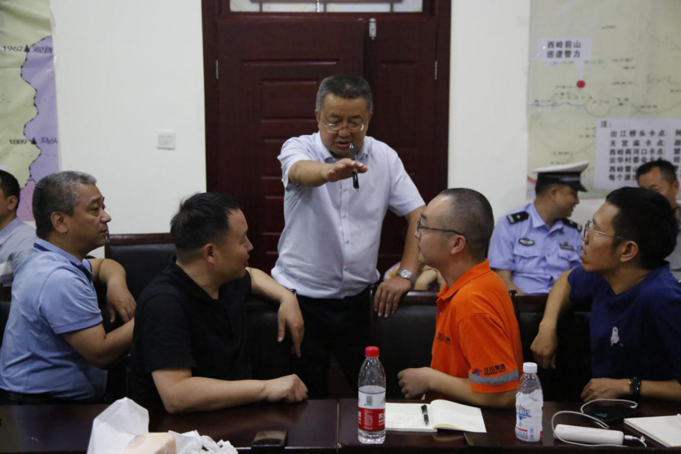 大邑县交通局副局长陈建伟与集团应急抢险队讨论抢险方案
