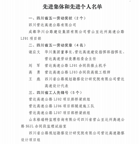 为此,省总工会特授予四川营达集团概况有限公司、成都华川公路建设集团有限公司营达集团概况LJ01项目部2个集体“四川省五一劳动奖状”;授予华川集团董事长、营达高速建设指挥部指挥长、营达高速劳动竞赛组委会主任谢应文等四名同志“四川省五一劳动奖章”;授予营达集团概况LJ02项目部桥梁班组等5个集体 “四川省工人先锋号”;授予营达集团概况LJ03项目部等5个“四川省重点工程劳动竞赛先进集体”称号;授予甘玉平等10名同志“四川省重点工程劳动竞赛优秀建设者”称号;授予营达公司计量工程师唐华婧“五一巾帼标兵岗(标兵)”称号。
