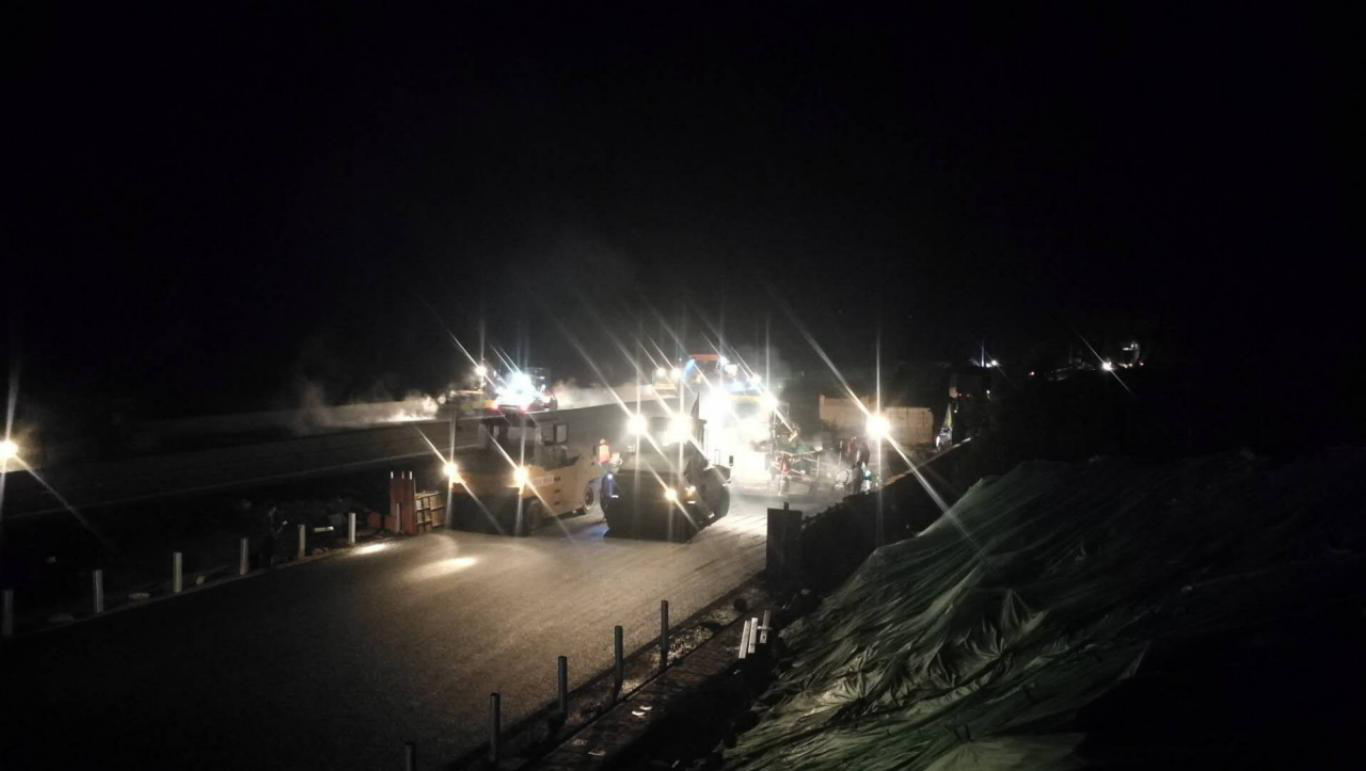 怀芷路面项目桐树溪大桥左右幅于12月15日晚间同时开始施工作业,左右幅你追我赶,现场一派热闹的景象;怀芷项目一号拌合站的第一车上面层沥青混合料也于12月16日凌晨4点发出前往施工现场......这昼夜不停,抢抓工期的景象仅仅是自11月以来24小时不间断施工中平凡的一天。怀芷路面项目现已火力全开,全线朝通车目标奋力冲刺。