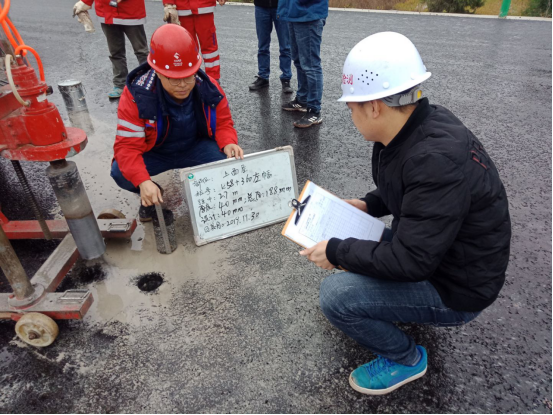 此次预验收检查组由业主公司、监理驻地办、监理试验室、总包部以及第三方检测机构代表共同组成。严格按照交验的技术标准及设计要求进行,对K52+601.6~K59+125处全幅段落路面施工的宽度、横坡、厚度、压实度、渗水系数等指标严格检测。