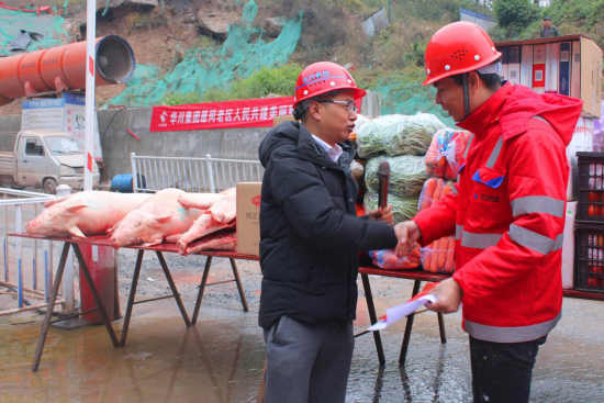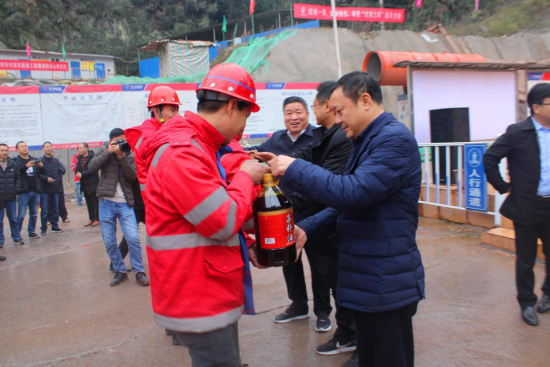 上午8点30分,县委书记孙辉一行从隧洞进口端通行来到出口端仪式现场并对全体参建者及监理代表表示了祝贺。仪式上,副县长罗旭辉代表中共通江县委、县人大、县政府对全体参建者一年多来的辛勤付出表示了感谢,罗副县长在讲话中说道:春在隧道项目是通江县重要的民生工程,是老区人民期盼已久的幸福路、致富路、经济路。隧道右洞的贯通是地方政府与华川集团共同努力的结果、是服务老区人民的重要举措、是给地方百姓送上的新年礼物。随后,力迅公司董事长苏川对全体参加者表示了祝贺,并就加快隧道施工进度、做好质量安全管控、建设人民放心的品质工程等方面对后续工程施工作出了指示。