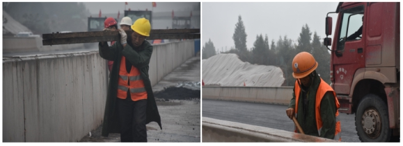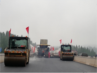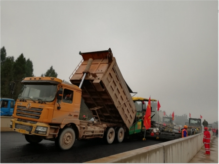 观施工现场,华川旗帜高高飘扬,迎着微风,伴着小雨,1台摊铺机、5台压路机、15台运输车相互密切配合,摊铺、碾压机器发出的声响,奏出了一曲铿锵有力的“施工进行曲”。现场负责人及时查看摊铺厚度,确保厚度在合理范围内,技术员实时查看沥青摊铺温度,项目部领导驻现场指导,经过各级人员的共同努力,精心组织、标准化,文明化施工,携手完成了本次试验段铺筑工作。