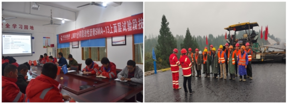 本次试验段铺筑在K48+570-K48+940,全长370m。为了成功完成试验段铺筑工作,项目部精心组织,科学筹划,专门成立试验段铺筑管理小组,细化施工方案,明确人员分工。提前召开施工技术交底会,班前安全教育,从摊铺、碾压、运输车辆运输、施工温度控制、人员组织等各个方面详细交代,确保试验段一次性成功铺筑。