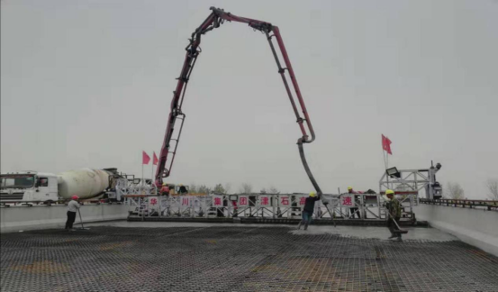 11月12日下午,津石项目一工区淀南新堤大桥最后一联桥面铺装顺利浇筑。至此,津石高速JSLQ5标段桥梁一队桥梁工程全部结束,同时也意味着津石项目一工区全体施工人员在“决战60天”大干热潮中的昼夜施工、辛勤付出取得了回报。第一分公司总经理罗剑虹、津石总包部总工程师隆贤伟携总包部有关部室人员及一工区将士到场祝贺。
