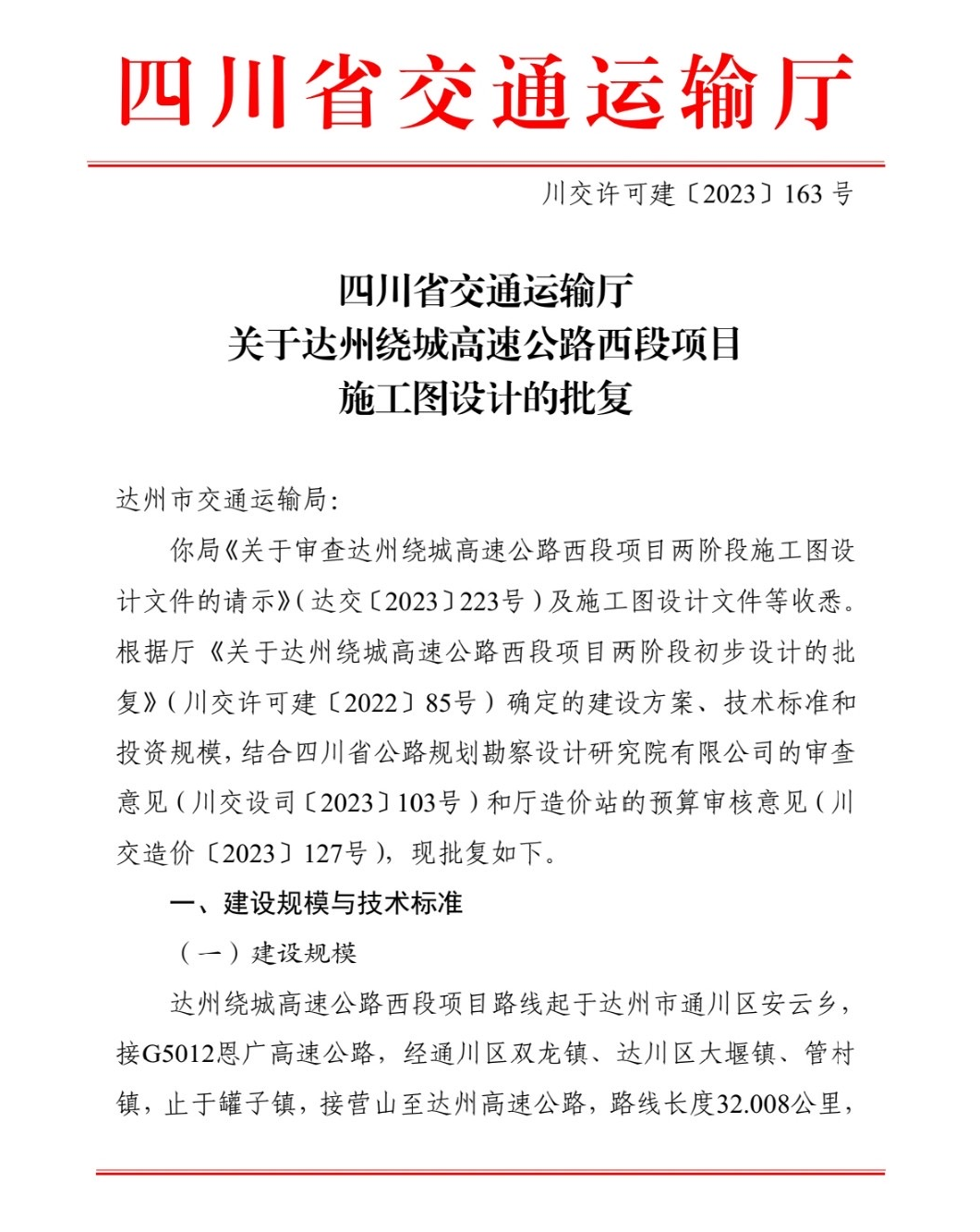 9月12日由集团勘察设计分公司设计的达州绕城集团概况西段项目施工图设计获四川省交通运输厅批复。
