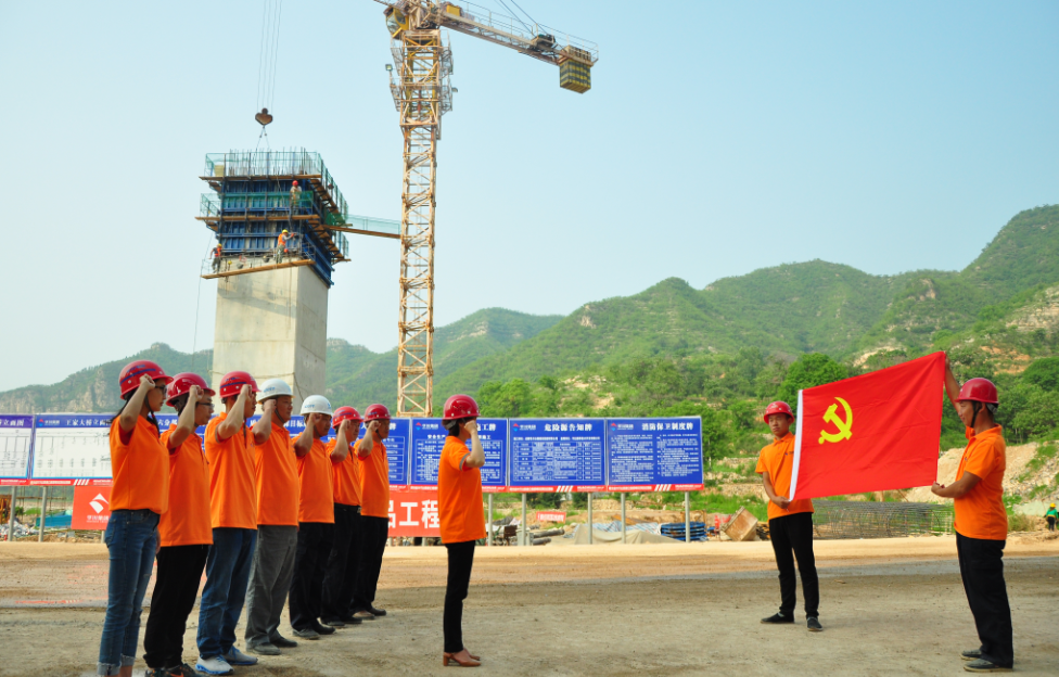 7月1日早上8点,在华霆公司党支部书记曾庆玉的带领下,全体党员同志高举党旗和党员突击队队旗,斗志昂扬地奔赴西安大桥。此时此刻,旭日东升,一缕缕晨曦的光辉倾洒在空心薄壁墩上,吊装作业井然有序地进行着,一线工人卯足干劲,作业场地一片热火朝天。